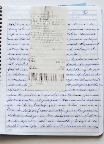Centeno también anotaba cada una de las direcciones de sus itinerarios diarios. Cuando iban a buscar un bolso o cuando iban a dejarlo, Centeno asentaba calle, número y de ser necesario departamento. Cada dirección que Centeno anotó fue chequeada por personal de la Policía Federal que trabajó desde hace meses en la investigación que encabezan el juez Claudio Bonadio y el fiscal Carlos Stornelli.