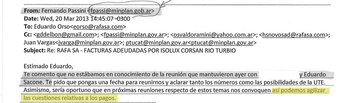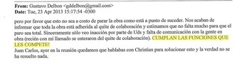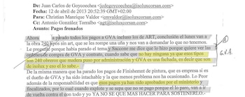 En una de esas cadenas de mails, De Goycoechea manifestó su enojó porque también se habían frenado los pagos de otra subcontratista llamada Finishment. "Es empresa si es el dueño de GVA (sic) y ha sido intachable y la que menos problemas nos ha ocasionado. Lo peor además de la responsabilidad es que esos pagos ya han sido aprobados por el Ministerio y fiscalizados", redactó.