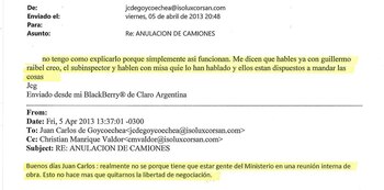 La presión era parte de una lógica. De los mails que incluye el dossier al que accedió Infobae se desprende que el Ministerio de Planificación tenía la última palabra sobre lo que sucedía en cada rincón de la obra. Tal es así, que el ingeniero Sánchez en algún momento le preguntó a De Goycoechea por qué había funcionarios nacionales en las reuniones privadas de la empresa. "No tengo cómo explicarlo, porque simplemente así funcionan", le respondió el CEO.