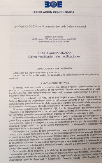 En la llamada "exposición de motivos" de la Ley Orgánica 5/2005, el entonces Rey Juan Carlos I hace referencia a los nuevos escenarios internacionales, la eliminación del servicio militar obligatorio, el fin de la guerra fría y fundamentalmente a la aparición del terrorismo como una nueva y cierta amenaza. También en varios pasajes de la norma aparecen nombrados en forma conjunta los términos seguridad y defensa. Lo mismo ocurre con la revolución tecnológica (ciberdefensa) y con el accionar conjunto de todas las Fuerzas Armadas, algo que Cambiemos aspira a lograr con las reformas impulsadas.