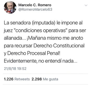 El fiscal Marcelo Romero manifestó su sorpresa e indignación en Twitter. "La senadora (imputada) le impone al juez 'condiciones operativas' para ser allanada… ¡Mañana mismo me anoto para recursar Derecho Constitucional y Derecho Procesal Penal! Evidentemente, no entendí nada….", escribió.