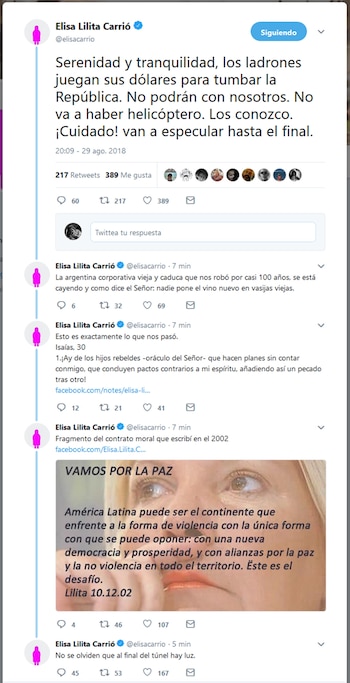 En el marco de un día de incertidumbre económica que continuó a pesar del anuncio de Mauricio Macri de que había alcanzado un nuevo acuerdo con el Fondo Monetario Internacional (FMI), la dirigente de Cambiemos Elisa Carrió aseguró que "los ladrones juegan sus dólares para tumbar la República. No podrán con nosotros. No va a haber helicóptero".