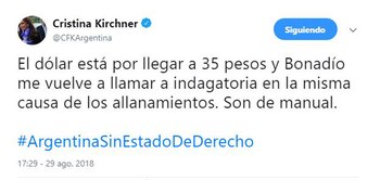En su cuenta de Twitter, Cristina Kirchner publicó: "El dólar está por llegar a 35 pesos y Bonadio me vuelve a llamar a indagatoria en la misma causa de los allanamientos. Son de manual. #ArgentinaSinEstadoDeDerecho".