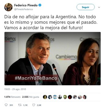 En este contexto, a través de Twitter el macrismo llamó a apoyar al Jefe de Estado, en el cierre de un día que estuvo marcado por la incertidumbre. El primer mensaje lo lanzó Cecilia Borel, integrante del equipo del vocero presidencial Iván Pavlovsky.