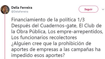 En el mismo sentido se expresó Delia Ferreira, presidente de Transparencia Internacional, quien aseguró que la prohibición de aportes de empresas "no impidió los aportes, los escondió; fomentó el uso de aportantes-fachada; dificultó acceder a información sobre el origen del dinero; ocultó compromisos, compra de favores, decisiones y decretos; ocultó los conflictos de interés; facilitó los aportes prohibidos y no impidió en nada la influencia de las empresas en la política".