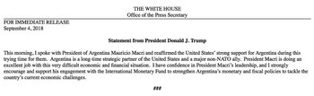 El presidente de los Estados Unidos, Donald Trump, se refirió públicamente a través de un comunicado de la Casa Blanca a la conversación telefónica que mantuvo este martes con Mauricio Macri en la que -aseguró- le transmitió "el fuerte respaldo" de su país a la Argentina.