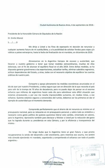 Apenas un día después de que el Gobierno anunciara medidas para profundizar el ajuste, el diputado de Neuquén Leandro López (Cambiemos) le envió una carta al titular de la Cámara baja, Emilio Monzó, para avisar que renuncia a futuros aumentos del sueldo que reciban los legisladores y a la posibilidad de pedir fondos para viajes o viáticos a países extranjeros hasta que concluya su mandato en diciembre de 2019.