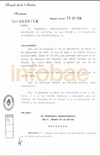 De una resolución de la Secretaría Administrativa del Senado con fecha del 20 de septiembre se desprende que el senador por Mendoza realizó el pedido de dejar sin efecto la baja de Obón, la que había solicitado el 17 de este mismo mes, apenas tres días antes.