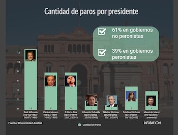 Raúl Alfonsín fue el presidente que soportó más paros generales durante su gestión: 13. Y Néstor Kirchner el que menos, apenas uno. Carlos Menem y Fernando De la Rúa tuvieron ocho paros generales, pero el dirigente peronista gobernó 10 años y el radical apenas dos. Eduardo Duhalde, que también gobernó dos años, tuvo dos. Y Cristina Kirchner, que estuvo en el poder ocho años, padeció cinco. Mauricio Macri, hasta ahora, va por cuatro.
