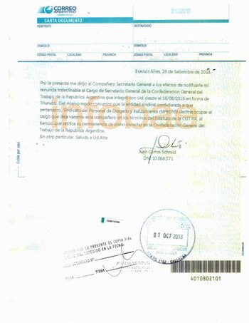 El escrito no da muchas pistas sobre los motivos de su alejamiento. "Me dirijo al Compañero Secretario General a los efectos de notificarle mi renuncia indeclinable al cargo de Secretario General de la Confederación General del Trabajo de la República Argentina", indica.