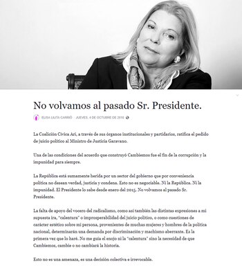 Un día después, la legisladora redobló la apuesta y publicó una carta dirigida a Mauricio Macri que se titula: "No volvamos al pasado, señor Presidente".