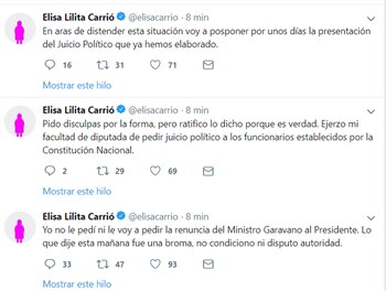 Sin embargo, minutos después de que se conociera el proyecto, Carrió escribió en sus redes sociales que iba a posponer la presentación, prevista para mañana: "Yo no le pedí ni le voy a pedir la renuncia del Ministro Garavano al Presidente. Lo que dije esta mañana fue una broma, no condiciono ni disputo autoridad".