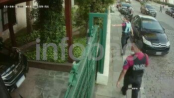 La secuencia dura 15 segundos. Viola tira la bolsa por arriba de la reja y corre. En las imágenes se puede percibir cómo, desde la vereda de enfrente de la casa del juez, uno de los agentes que la Policía de la Ciudad dispuso para custodiar a Bonadio corre para detener a Viola.
