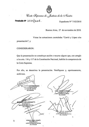 Sin embargo, por unanimidad y citando los artículos 116 y 117 de la Constitución Nacional, el ente presidido por Carlos Rosenkrantz lo desestimó por considerar que "no constituye acción o recurso alguno que habilite la competencia de la Corte Suprema".