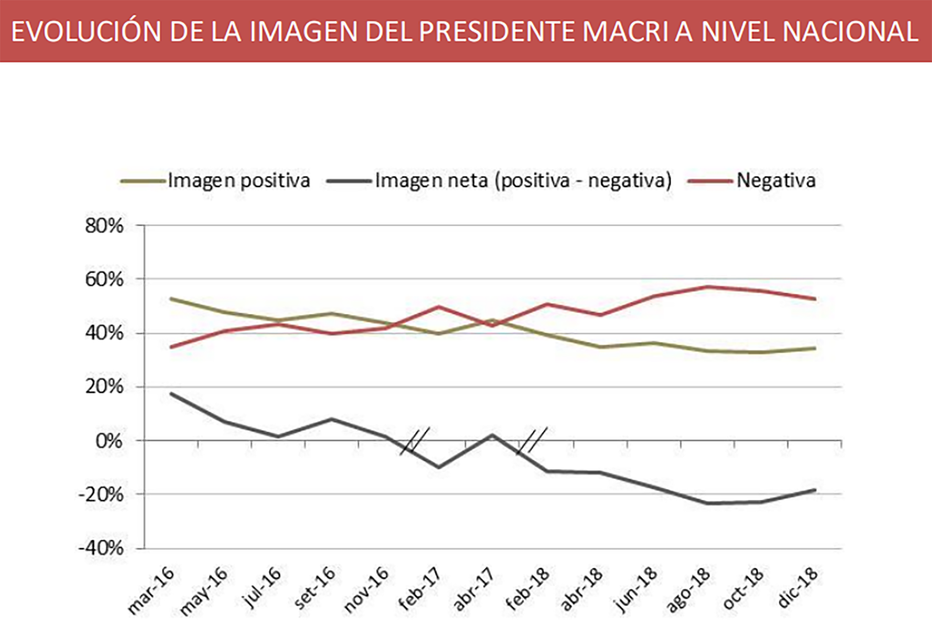 En esa línea, la consultora Synopsis reveló que "la valoración del desempeño del Gobierno de Mauricio Macri logró, por segundo mes consecutivo, una leve recuperación en la valoración positiva (+0,6), pero lo más significativo de diciembre fue la caída de -3,3 puntos porcentuales de la imagen negativa del Gobierno que pudiera estar asociada al éxito de la Cumbre del G20. De esta manera el diferencial negativo se achica en casi 4 puntos (-3,9) respecto del observado en noviembre".