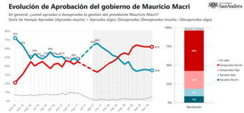 Por último, la Universidad de San Andrés difundió un estudio que sostiene que "desde el mes de agosto, registramos un stop en la caída producida durante 10 meses consecutivos. Esto implica una estabilización en la opinión pública. Probablemente, el Gobierno haya encontrado su 'piso'. El total de los que desaprueban al gobierno es del 62% mientras que un 76% está insatisfecho con la marcha general de las cosas".