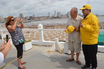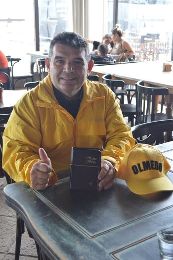 Olmedo está sentado en una de las mesas de madera de la clásica confitería marplatense de cara al mar y con un pocillo de café enfrente que terminó hace rato. Hace calor pero no se saca su campera amarilla, esa con la que todos esperan verlo. Él les da el gusto.