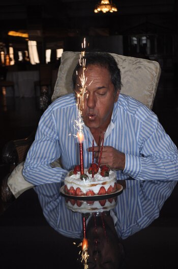 Soplando las velitas de una torta de frutilla Scioli recibió sus 62 años en un íntimo festejo donde se destacó la presencia de Sergio Berni. El ex secretario de Seguridad de la Nación le obsequió un mate celeste y blanco con la leyenda alusiva a su candidatura por la provincia de Buenos Aires: Berni 2019.