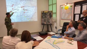 En el centro logístico, ubicado en el barrio de La Liguria, Macri recibió información de las autoridades del Ejército Argentino sobre las zonas afectadas por las intensas lluvias que se registraron en la región en las últimas semanas.