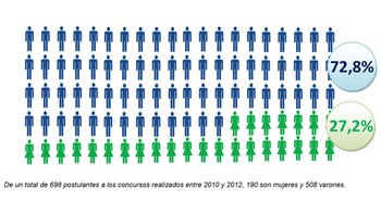 "En cuanto al nivel de estudios alcanzados, el 34,7% de las mujeres que se presentan a los concursos cuenta con título de maestría o doctorado, mientras que en el caso de los varones, sólo el 30,2%. Por lo que en promedio las mujeres logran un mayor nivel de estudios", agrega el texto.