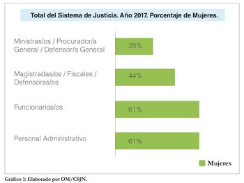 De acuerdo con dicho informe, sobre el total de integrantes del Sistema de Justicia del año 2017, el porcentaje de mujeres es el siguiente: