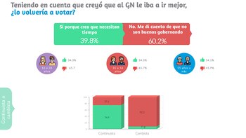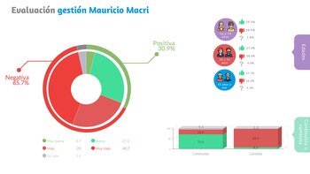 Consultados sobre las expectativas con respecto a la gestión de Cambiemos, el 55,4% respondió que creyó que al Gobierno le iba a ir mejor, el 9% sostuvo que hasta ahora cumplió con sus expectativas y un 33,7% señaló que nunca tuvo buenas expectativas sobre lo que podía hacer Mauricio Macri en la presidencia. Además, el 60,2% contestó que no volvería votar a Macri mientras que un 39,8% lo acompañaría porque cree que necesita más tiempo.