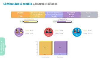 Otra de las consultas que realizó la encuestadora es sobre el futuro gobierno argentino. Los consultados tuvieron que decidir entre continuidad o cambio. El 2,9% quiere que siga Mauricio Macri, el 32,5% pretende que siga Macri pero con mejoras, el 10,1% quiere que cambie la gestión actual pero que se mantengan los avances logrados y el 51,4% desea que cambie el gobierno de Cambiemos.