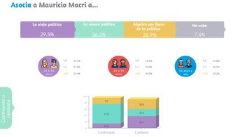 Diferente es la situación del presidente Mauricio Macri. El 29,5% lo asocia a la vieja política, un 36,2% lo relaciona a la nueva política y un 26,9% lo vincula con un dirigente que está por fuera de la política.