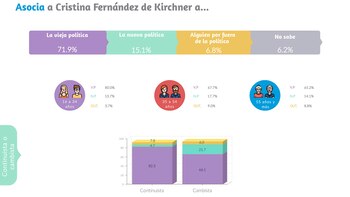 El 71,9% de los encuestados asocia a la ex presidenta Cristina Kirchner a la vieja política mientras que solo un 15,1% la relaciona con la nueva política. El 80% de los consultados en el rango que va entre los 16 y los 34 años la relacionan al pasado mientras que en el rango que va de 35 a 54 años es un 67,7%.