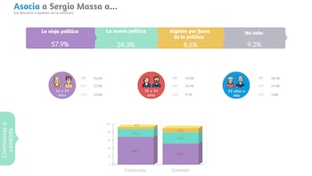 Otro de los dirigentes evaluados fue el líder del Frente Renovador, Sergio Massa. El 57,9% de los encuestados lo asocia a la vieja política. Así lo sostuvo un 56,6% en el rango que va entre los 16 y los 34 años y un 59% en el que va de 35 a 54 años. Por otra parte, el 24,3% lo asocia a la nueva política y un 8,6% lo vincula a un dirigente por fuera de la política.