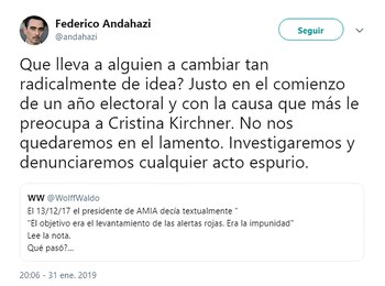En su cuenta de Twitter, el periodista Federico Andahazi se preguntó: "Qué lleva a alguien a cambiar tan radicalmente de idea? Justo en el comienzo de un año electoral y con la causa que más preocupa a Cristina Kirchner. No nos quedaremos en el lamento. Investigaremos y denunciaremos cualquier acto espurio".
