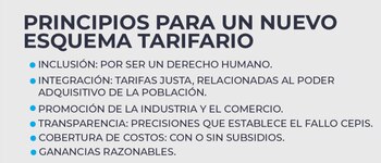 A su vez, dicho esquema tarifario "tiene que estar asociado a principios como inclusión, integración, la promoción de la industria y el comercio, la transparencia, la cobertura de costos y ganancias razonables", concluyó.