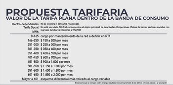 Además, realizó una propuesta que tenga en cuenta un valor de "tarifa plana" dentro de una banda de consumo, donde –sostuvo– "no se les cobre el consumo relacionado a los electrodependientes, y una tarifa social que no esté asociada solo al consumo sino también a cooperativas, clubes de barrio, y sectores sociales con ingresos familiares inferiores a dos salarios mínimos".