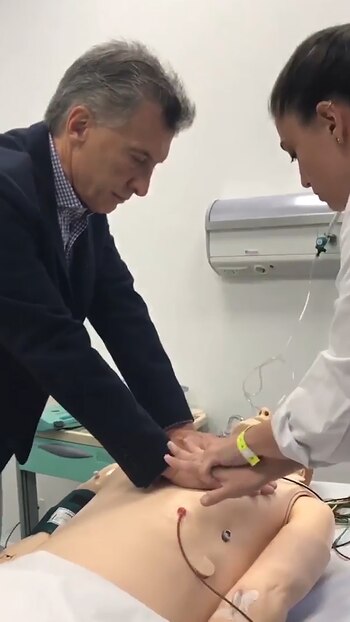 "La fuerza la hace con su torso hacia abajo y la frecuencia es de 120 por minuto", le decía la enfermera a Macri mientras controlaba que estuviese haciendo bien los movimientos de reanimación. "Se hace constantemente hasta que vemos que el paciente recobra sentido o uno se agota físicamente", remarcó la mujer.
