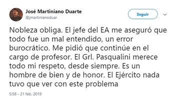 Incluso se había mencionado la posibilidad que Duarte sea apartado de su cargo docente en el Colegio Militar pero él mismo aclaró: "Nobleza obliga. El jefe del EA (Ejército Argentino) me aseguró que todo fue un mal entendido, un error burocrático. Me pidió que continúe en el cargo de profesor. El general (Claudio) Pasqualini merece todo mi respeto, desde siempre. Es un hombre de bien y de honor. El Ejército nada tuvo que ver con este problema".