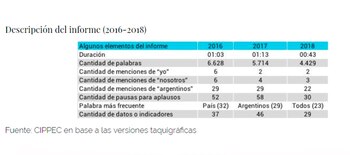 Según un informe realizado por el Centro de Implementación de Políticas Públicas para la Equidad y el Crecimiento (Cippec) en base a las versiones taquigráficas de los discursos de todos los presidentes desde 1983, los informes sobre el estado de la Nación registran una tendencia a explicar la efectividad de las políticas públicas con datos de escasa calidad y de poca continuidad.