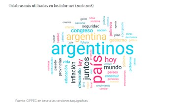 En cuando a lo discursivo, las palabras más utilizadas por el presidente Macri están vinculadas a la identificación con la idea de Nación: se utilizan términos como "argentinos" (80), "país" (71) y "Argentina" (45). Esta interpelación a una identidad colectiva también está presente al analizar los informes brindados entre 1995 y 2015, donde las palabras más utilizadas son "Argentina" (861), "país" (682) y "nacional" (493).
