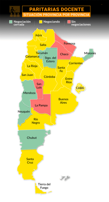 Solo seis jurisdicciones lograron llegar a un acuerdo salarial con sus docentes: Mendoza, Misiones, Santiago del Estero, Tucumán, Neuquén y la ciudad de Buenos Aires, donde pese a la firma mayoritaria, 2 de los 16 sindicatos -UTE y Ademys- convocaron a huelga.