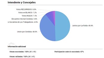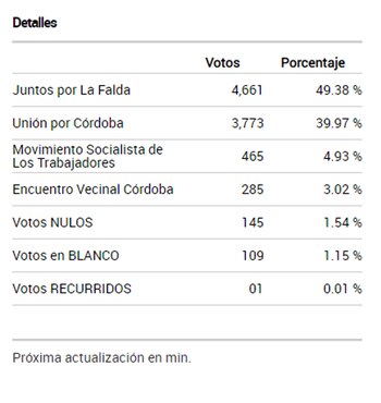 Ya escrutada la totalidad de las mesas, Juntos por La Falda se impuso con el 49,38% de los votos; la alianza peronista de Unión por Córdoba obtuvo el 39,97% con su candidato a intendente Miguel Maldonado; el Movimiento Socialista de los Trabajadores (MST), con Macarena Montoya, sacó el 4,93% y Encuentro Vecinal Córdoba, con Diego Olmos, logró el 3,02%.