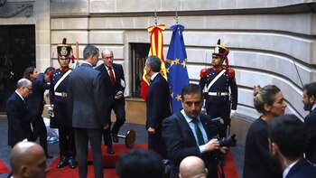 El ingreso del Rey al edificio de la Cancillería también fue accidentado, aunque esta vez hubo un imprevisto de por medio: el viento le jugó una mala pasada al equipo de ceremonial del gobierno argentino.