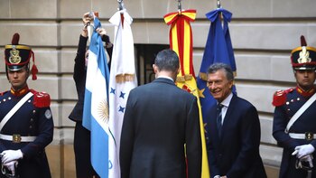 El video es gráfico. Suenan las trompetas, los ganaderos cumplen con el protocolo, el canciller Jorge Faurie marca el camino, ingresan Felipe VI y Macri…. pero algo interrumpe su marcha. De golpe, la sorpresa. Los jefes de Estado se miran, el argentino esboza una sonrisa nerviosa. De fondo se observa a varios funcionarios tratando de resolver el contratiempo. Increíble, pero real: mientras ingresaban los líderes al Palacio San Martín, el viento volteó las banderas del Mercosur y de la Argentina. El destino: la española y la de la Unión Europea resistieron estoicas el embate de la meteorología.