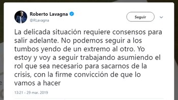 "No podemos seguir a los tumbos yendo de un extremo al otro", publicó Lavagna en un mensaje en su cuenta de Twitter, y a continuación destacó: "Yo estoy y voy a seguir trabajando asumiendo el rol que sea necesario para sacarnos de la crisis".