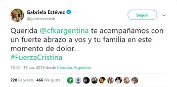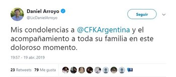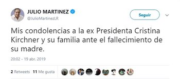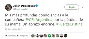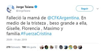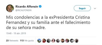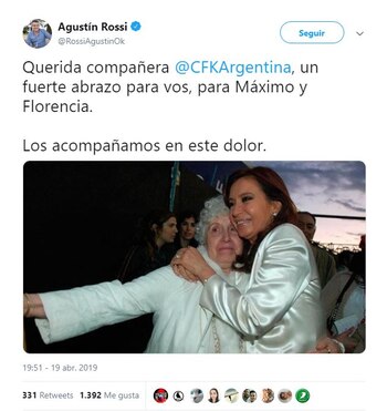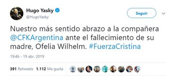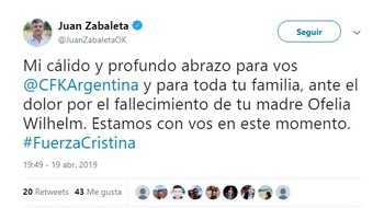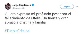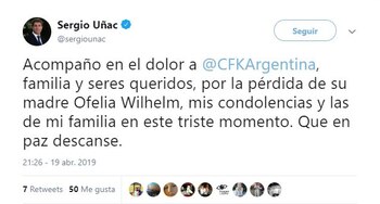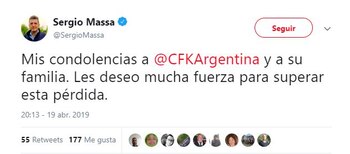 Mensaje similar dedicó el líder del Frente Renovador Sergio Massa: "Mis condolencias a @CFKArgentina y a su familia. Les deseo mucha fuerza para superar esta pérdida".