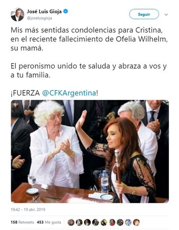 El presidente del PJ Nacional y diputado nacional José Luis Gioja también compartió un cálido saludo: "Mis más sentidas condolencias para Cristina, en el reciente fallecimiento de Ofelia Wilhelm, su mamá. El peronismo unido te saluda y abraza a vos y a tu familia".