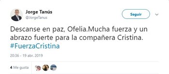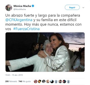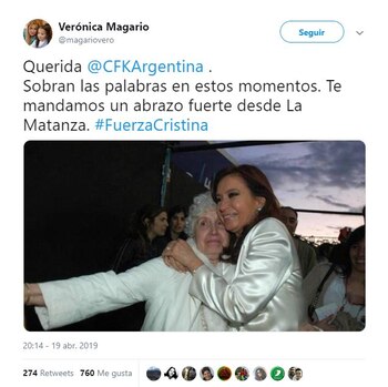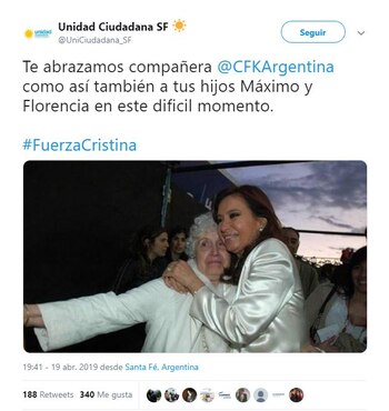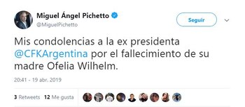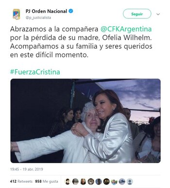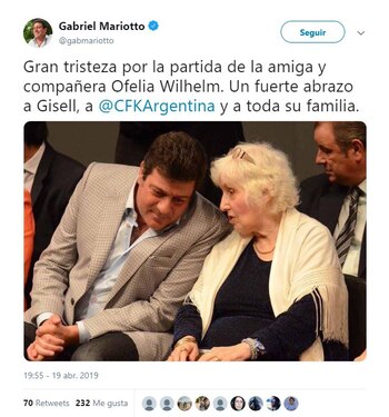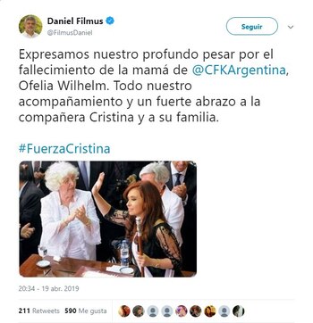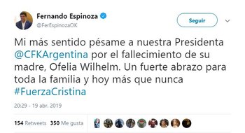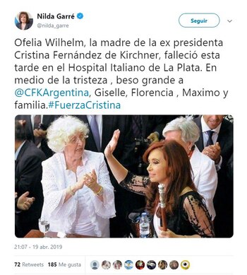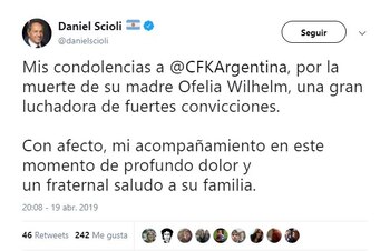 "Mis condolencias a @CFKArgentina, por la muerte de su madre Ofelia Wilhelm, una gran luchadora de fuertes convicciones. Con afecto, mi acompañamiento en este momento de profundo dolor y un fraternal saludo a su familia", dijo por su lado el diputado nacional y precandidato a Presidente Daniel Scioli.