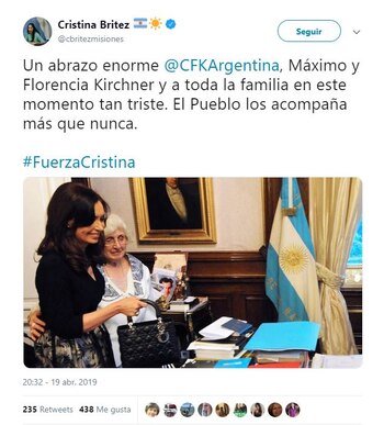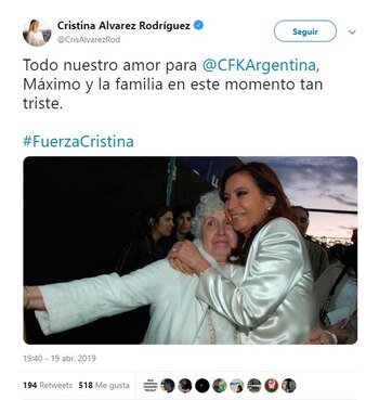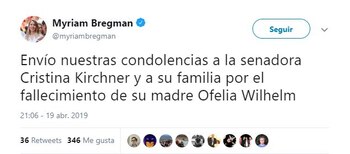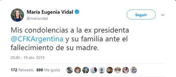 "Mis condolencias a la ex presidenta @CFKArgentina y su familia ante el fallecimiento de su madre", expresó a través de su cuenta de Twitter la gobernadora de la provincia de Buenos Aires María Eugenia Vidal.