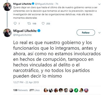 En las redes, Lifschtiz reforzó su contraataque a las declaraciones de Carrió: "Lo real es que nuestro gobierno y los funcionarios que lo integramos, antes y ahora, así como no estamos involucrados en hechos de corrupción, tampoco en hechos vinculados al delito o el narcotráfico, y no todos los partidos pueden decir lo mismo".