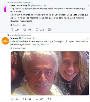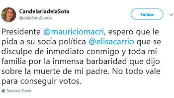Poco después, la periodista Candelaria De la Sota, hija del ex gobernador, apeló a través de Twitter directamente al presidente Mauricio Macri, para que "le pida a su socia política Elisa Carrió que se disculpe de inmediato" con su familia y agregó: "No todo vale para conseguir votos".