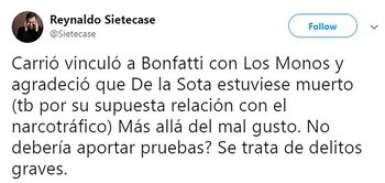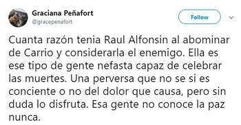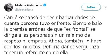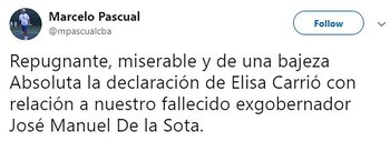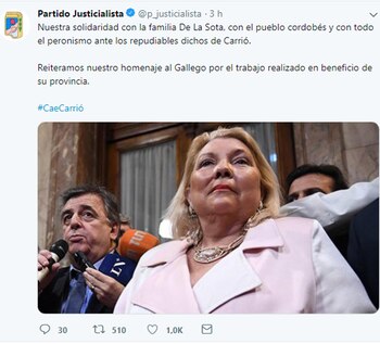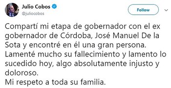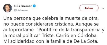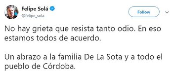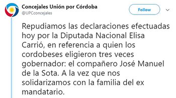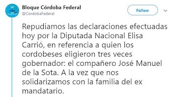 En esa línea, otra de las hijas del ex Gobernador, la concejala de la ciudad de Córdoba, Natalia De la Sota, se refirió a los dichos de Carrió en las redes sociales: "Ante tanto odio, tanta bajeza y tanta infamia, no sirven las palabras. Basta con sentir el respeto, el amor y el agradecimiento que tiene Córdoba por ese gran hombre que fue José Manuel de la Sota. Esa es la única respuesta posible".