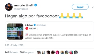 "Hagan algo, por favor", escribió el conductor y empresario televisivo en su cuenta de la red social Twitter, junto al link de una nota publicada en Infobae que se titula: "El Riesgo País argentino llegó a superar los 1.000 puntos básicos y sigue en máximos desde 2014".
